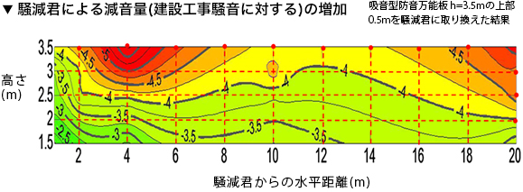 騒減君により同じ高さの防音壁より工事音を3dB~5dB低減する。